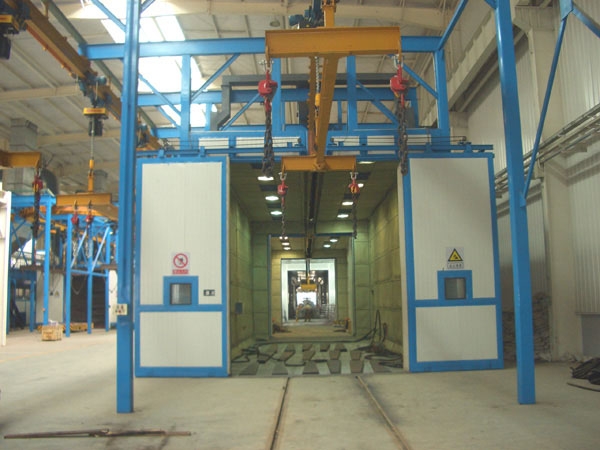規(guī)格及特點(diǎn):PLC控制,室外液晶顯示器自動顯示拋丸器的回轉(zhuǎn)角度、高度、拋丸架和臺車位置。PLC控制操作整個設(shè)備運(yùn)行,點(diǎn)動后,只要工人注意工作情況即可,無需再去人工操作,直到工件自動走出工作室。清理工件以機(jī)械拋丸為主,人工噴丸為輔,被清理工件表面達(dá)Sa2.5-Sa3級。